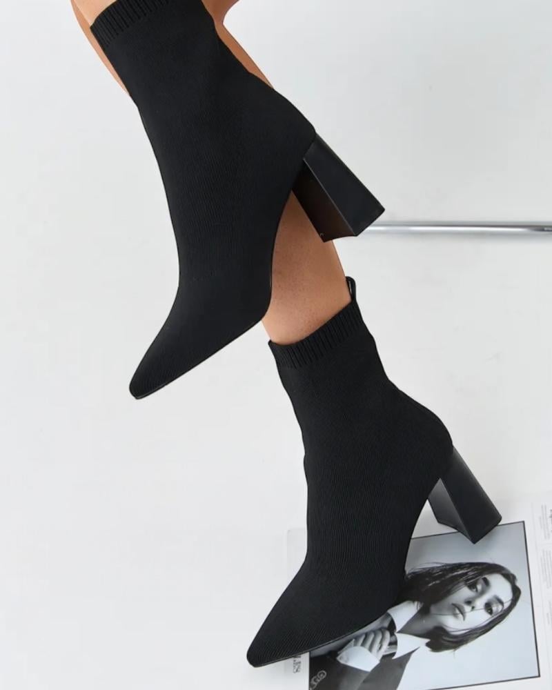 بوت نسائي أسود بكعب عالي سميك وتصميم جورب أنيق