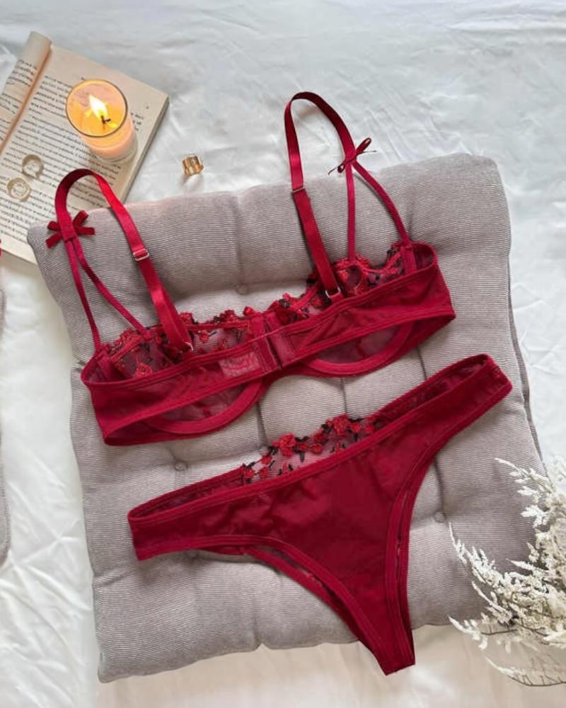 طقم ملابس داخلي من شبكة مطرزة بزهور - عنابي