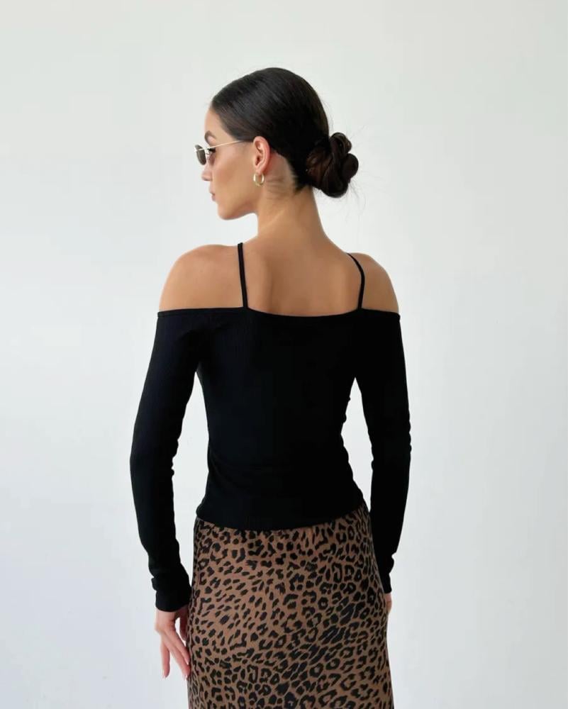 بلوزة سوداء بأكمام طويلة وتصميم أكتاف مفتوحة مع رباط متقاطع